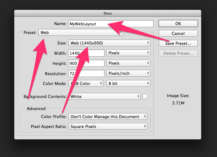 There are various presets to choose from. We'll pick the 'Web' preset and then the 'Web (1440x900)' size preset. We can also give our project a name here. But, before we click 'OK', we'll update the sizes as shown in the second screenshot below.