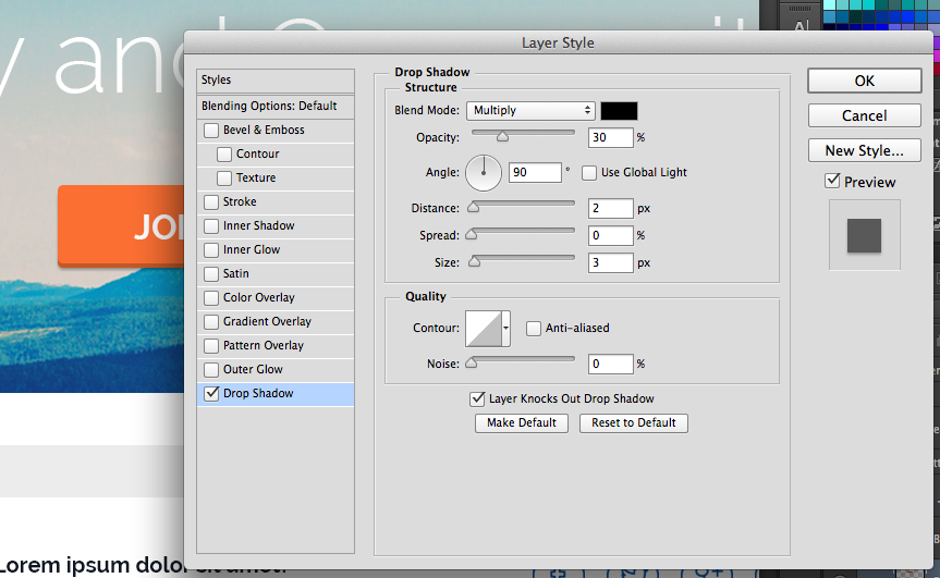 You could complete this effect with a subtle dropshadow. Double-click the lower, darker button rectangle layer (not to rename it; click to the right of the layer's name) to open the Layer Style dialogue box. Here, experiment with the settings to see what looks best. The screenshot below shows an example, but your final choice will depend on your design.