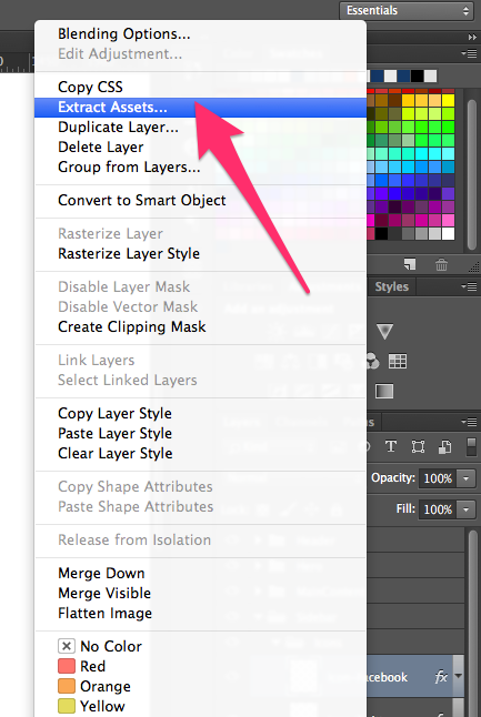 To export one of the elements from your document, right-click on its layer and choose 'Extract Assets...' in order to open up a new dialogue box.