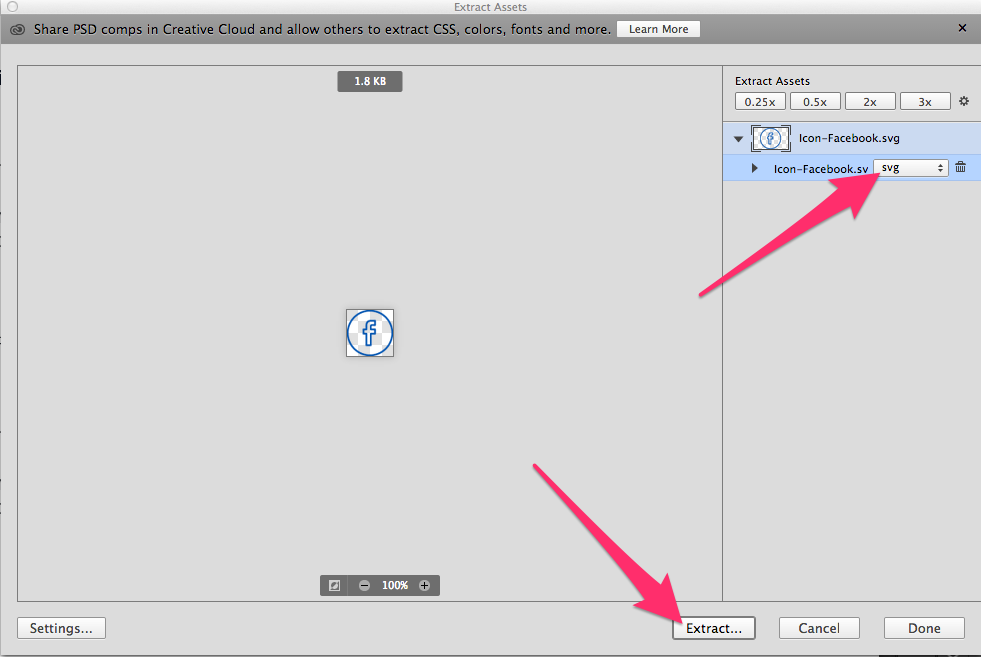 Review the settings here (using the screenshot below as an example for exporting an icon in SVG format), and then click 'Extract...'.