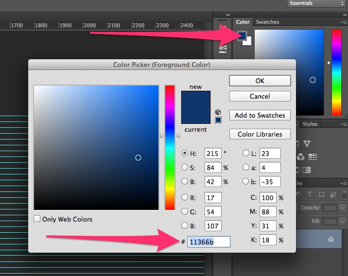 First, click on the foreground colour square to open up the colour selection box. Then enter the hex code of the first colour from your chosen palette and click 'OK'.