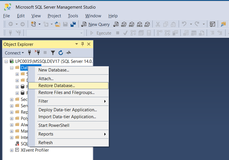 Right click on the Database and click on ‘Restore Database..’ from the context menu.