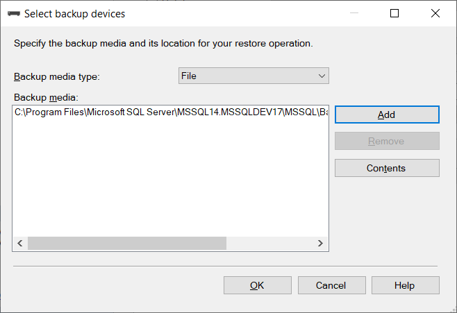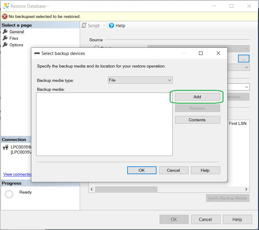 On the Restore Database window select Device and click the ellipsis button with three dots top open the ‘Select backup devices’ dialog box.