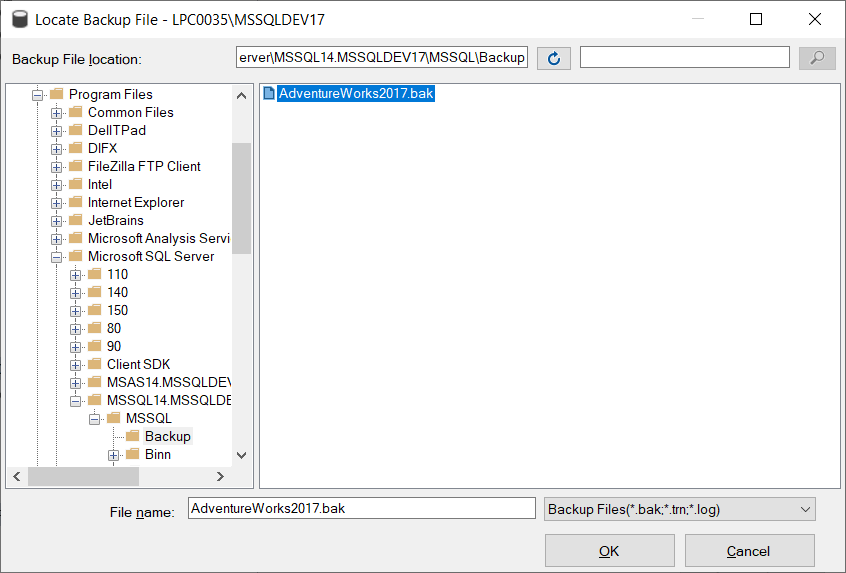 In SSMS, close the Locate Backup File window and open it again. The AdventureWorks2017.bak will be appeared here. Select the backup file and click the OK button.