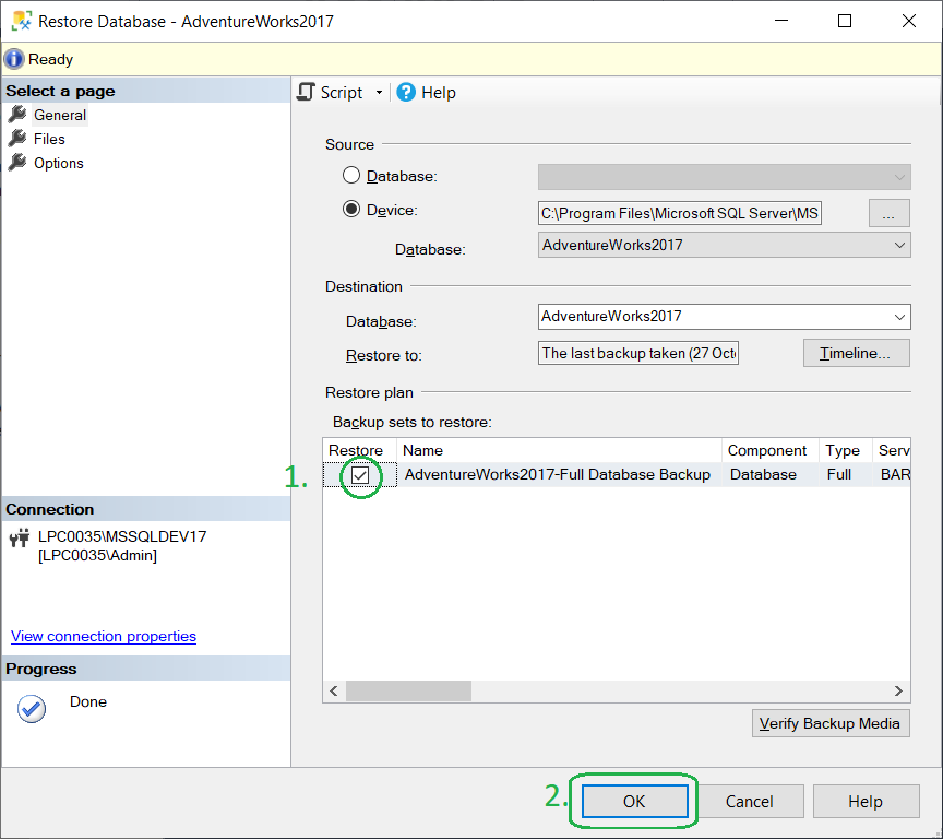 On the Restore Database window, make sure the Restore option is checked and click the OK button.