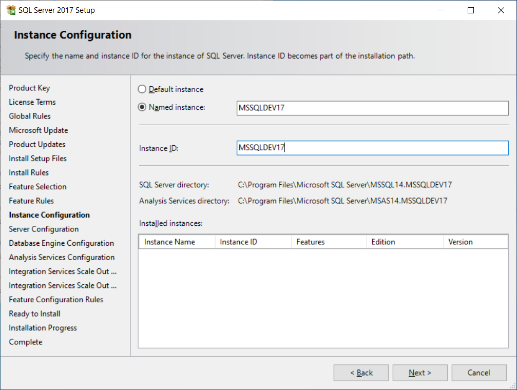 Specify the name and instance ID for the instance of SQL Server. If you select the Default instance option then your computer name will be your database server name. If you select the Name instance option then you need to provide a name and your database server name will be [your computer name]\[instance name]. Click the Next button.