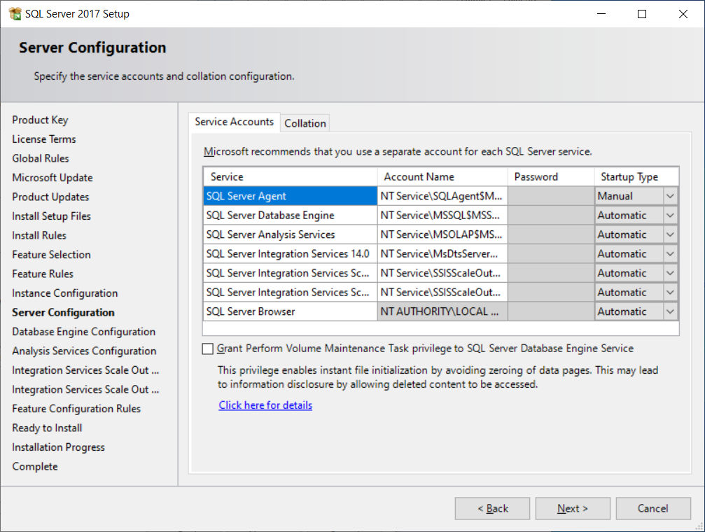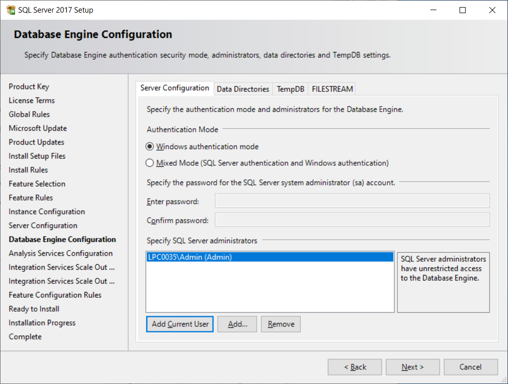 On the Database Engine Configuration pages, specify Database Engine authentication security mode, administrators. You can always change this configuration after completing the installation.