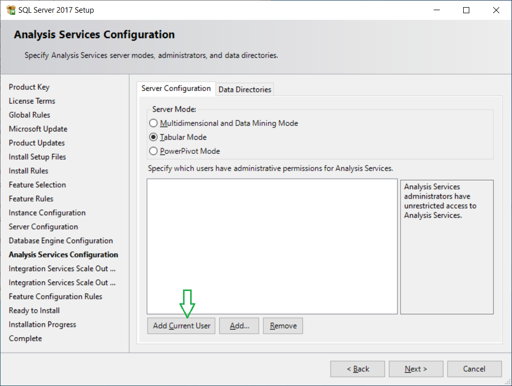 You’ll see this page if you had selected the Analysis Services feature. Select a server mode and click the ‘Add Current User’ button to provide administrative permission to the current user.
