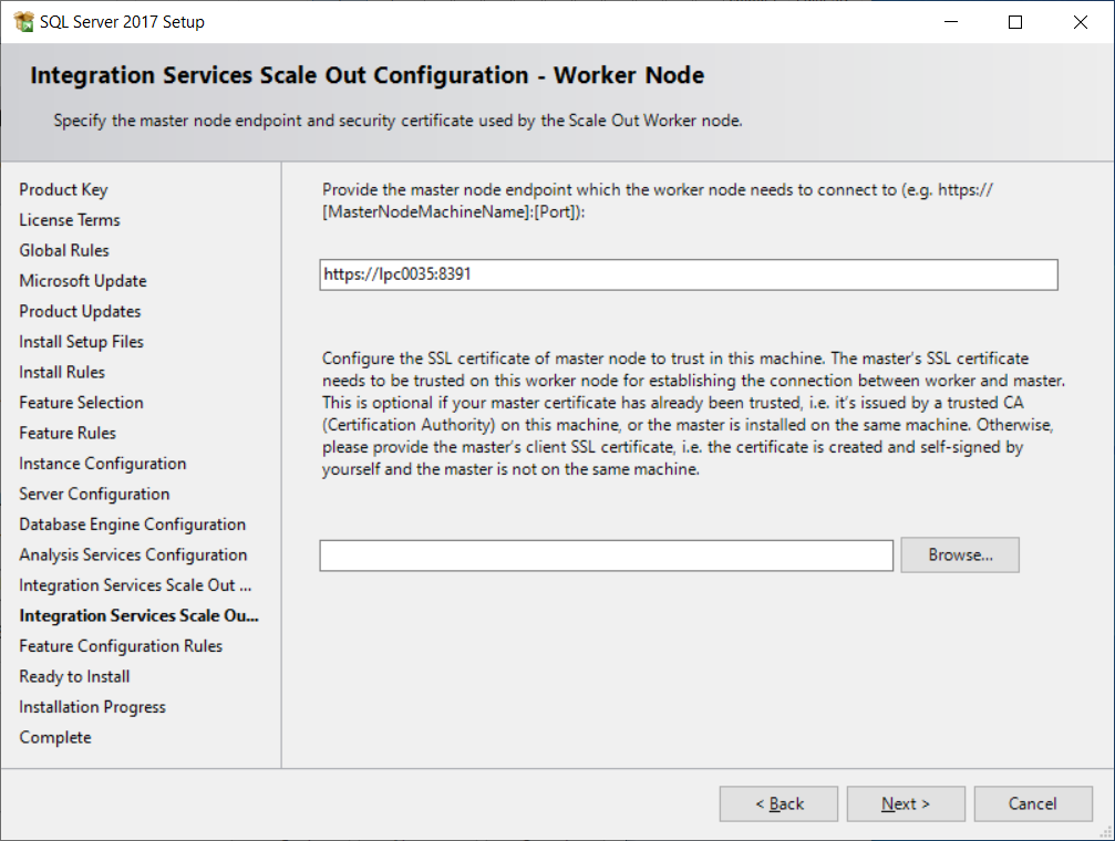 If you selected the Integration Feature, then you will see this window to specify the master node endpoint and security certificate used by the Scale Out Worker node. Change the settings if you need or accept all default settings and click the Next button.