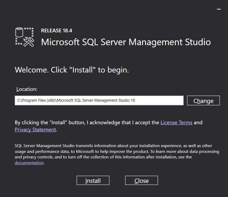 Once downloaded, run the SSMS-Setup-ENU.exe file to start installation wizard. You may change the installation location or accept the existing location. Click the Install button.