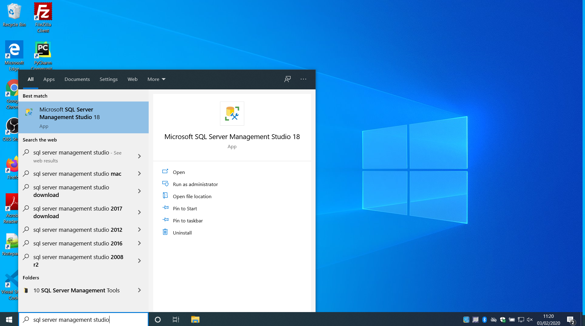 After restarting the computer search for ‘sql server management studio’. Click on the ‘Microsoft SQL Server Management Studio 18’ app to start it.