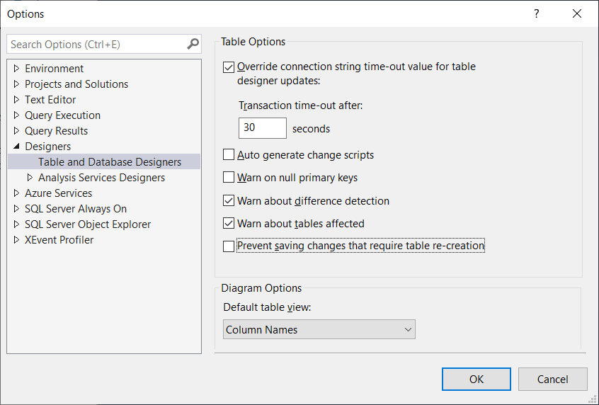 On the Option window, expand Designers > Table and Database Designers > uncheck the option ‘Prevent saving changes that require table re-creation’.