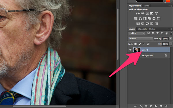 Press ‘CTRL+J’ (on WIndows) or ‘CMD+J’ (on a Mac) to create a duplicate of this layer, named Layer 1 - we can now work safely knowing that we have the untouched original photo as the bottom layer should be need to start again