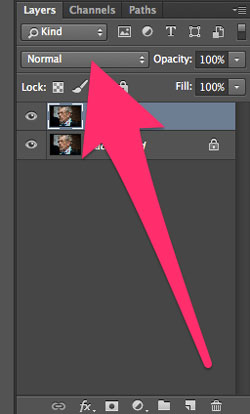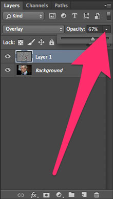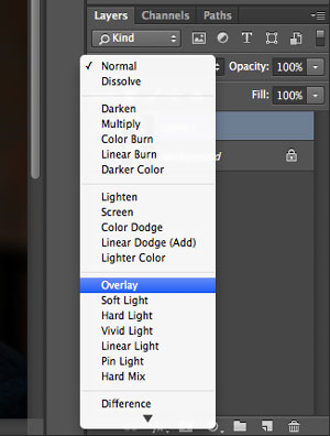 With your new ‘Layer 1’ selected (click on it to make sure), change its blend mode to ‘Overlay’ from the drop-down menu near the top of the Layers panel