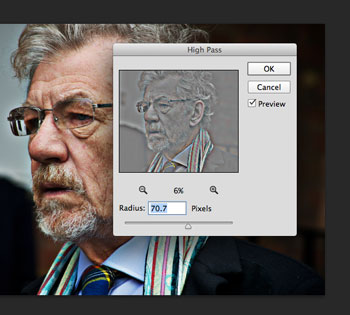 Make sure that the Preview box is checked in the High Pass dialog box, and zoom out of the preview image to see the whole thing if you need to so that you can choose a Radius that makes your preview look like the one in our screenshot above