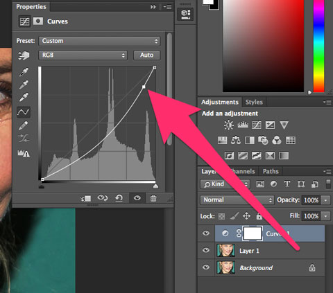 In the Curves properties panel that opens, reduce the lightness of the image so skin tones are warmer (you may want to do the opposite if the tones in your picture need to be cooler) - do this by clicking on the graph’s line near the top and dragging it downwards slightly
