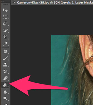 Now make sure the mask on your Levels layer is selected and then select the fill icon in the left-hand menu, make sure your foreground colour is set to black and then click on your photo to fill the mask with black