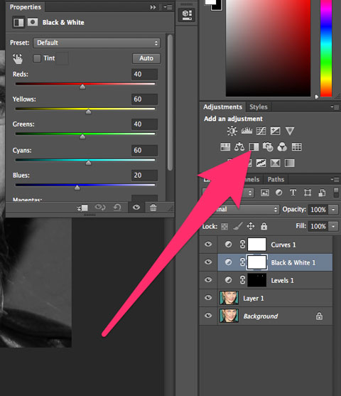 Zoom out of your image and make the Black & White adjustment layer invisible to check the results of your work