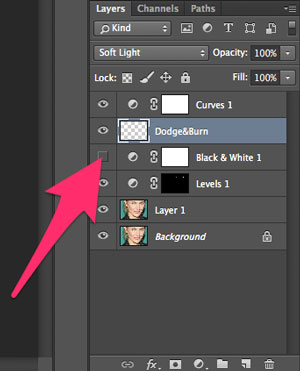 Now create a new empty layer above Black & White adjustment layer with ‘Soft Light’ blending mode applied - name this layer ‘Dodge&Burn’