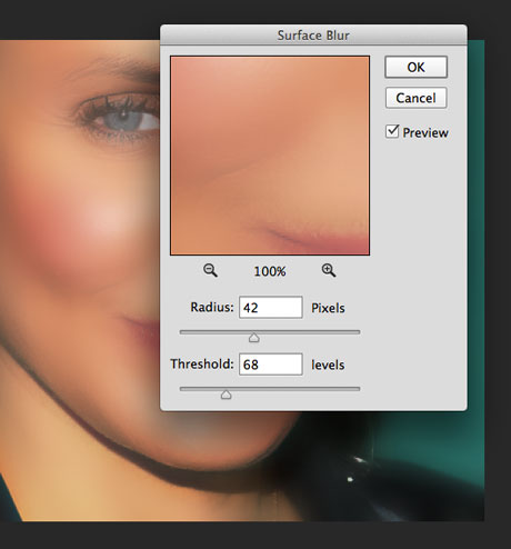 In the Surface Blur options box, set the Threshold value to 255 levels, then adjust the Radius until the face is almost too blurry to see