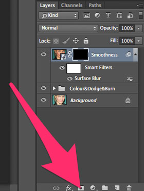 With this black/inverted layer mask selected, use a soft white brush at about 50% opacity on the photo to bring back the skin-smoothing effects from the ‘Smoothness’ layer to the areas where it looks most natural